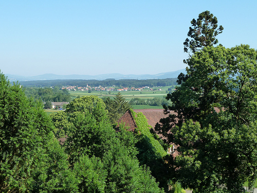 The walk into Sebersdorf was interesting. There were many cherry trees in fruit and the countryside is very varied with mixed crops (pumpkin, corn etc.) in the low land and forests on the hilltops. Downtown Sebersdorf consists of a fire station, a very nice lily pond and a bank with an ATM. The station is way out of town on the other side of the highway. We had a beer on the way back and directed a couple from Vienna who were wedding guests and who didn't know where the Schloss was.